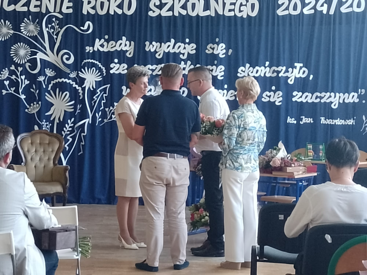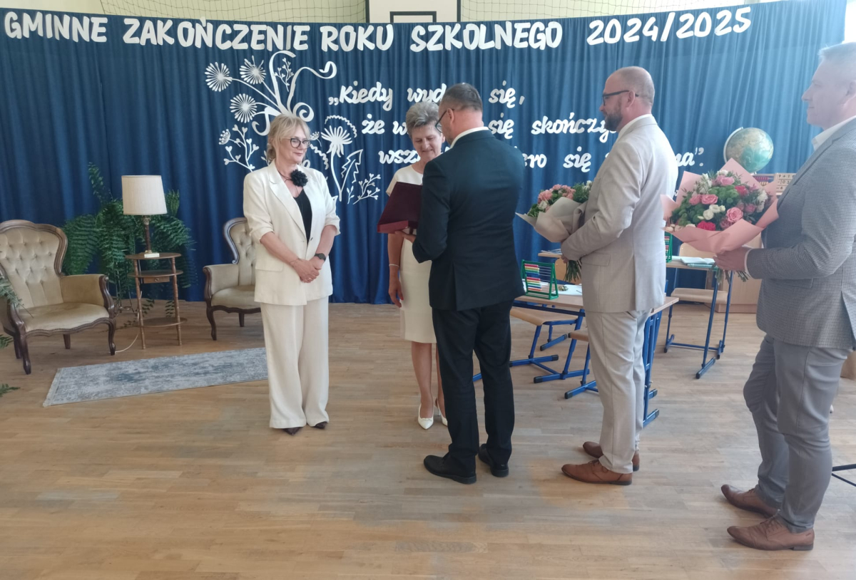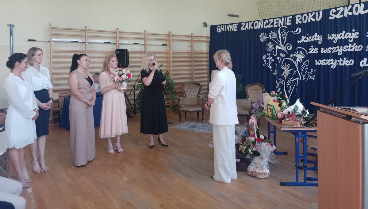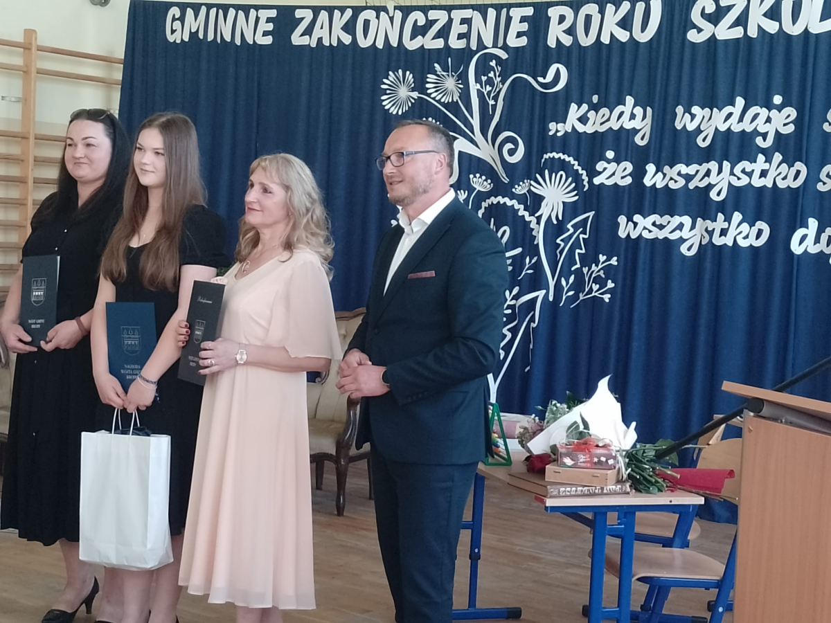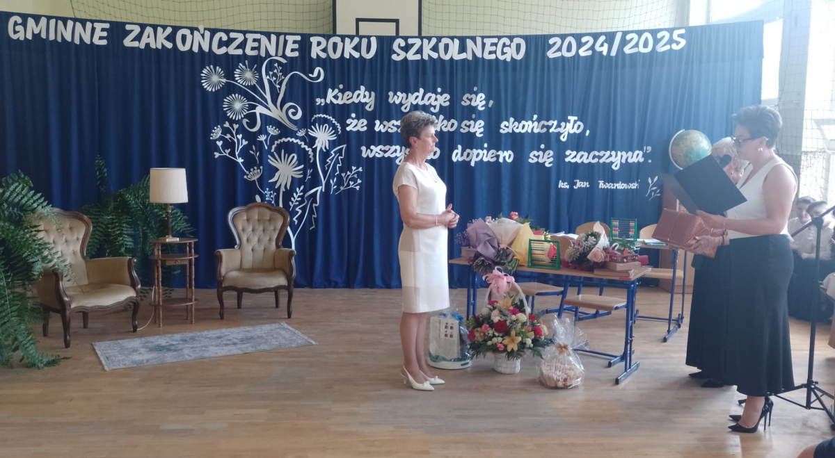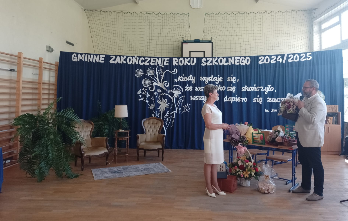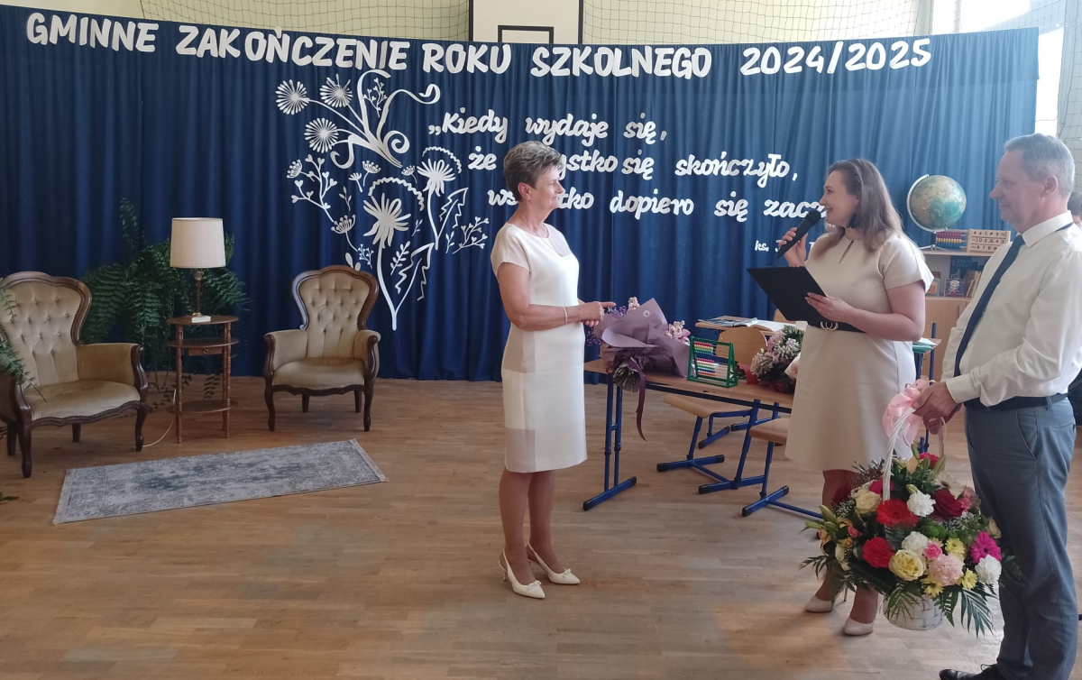 Na emeryturę odeszły dyrektor placówki - pani Nina Milanowska i dyrektor Centrum Usług Wspólnych - pani Dorota Grudnicka - Glina. Pan Wójt Ernest Kumek podziękował obydwu paniom za lata odpowiedzialnej pracy na rzecz społeczności szkolnej oraz gratulował sukcesów wyróżnionym uczniom. Całości dopełnił wzruszający, ale też pełen humoru program artystyczny.