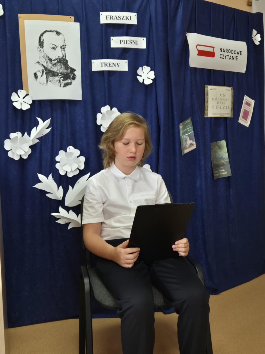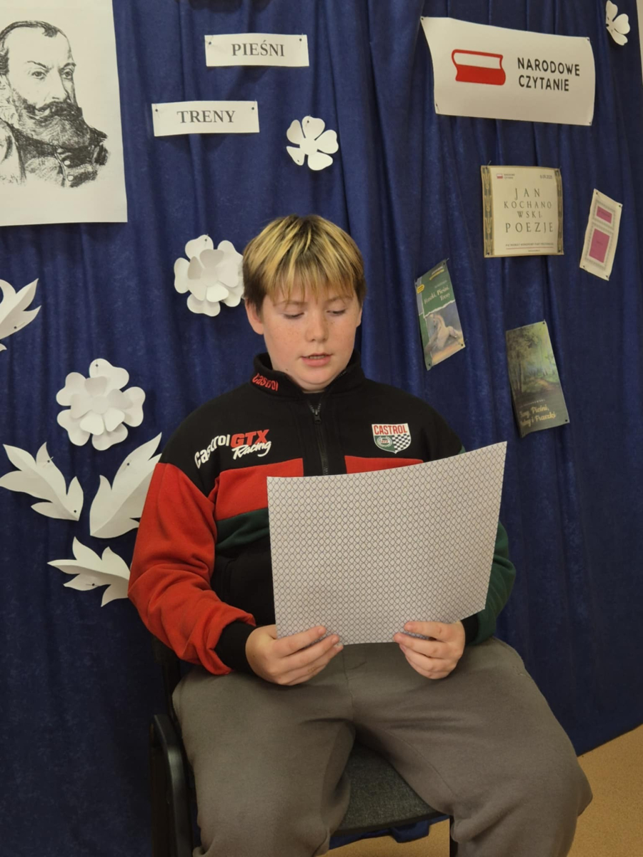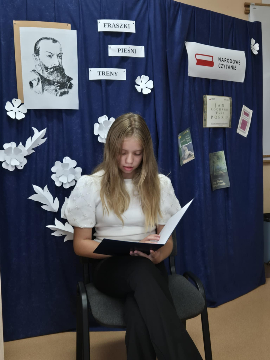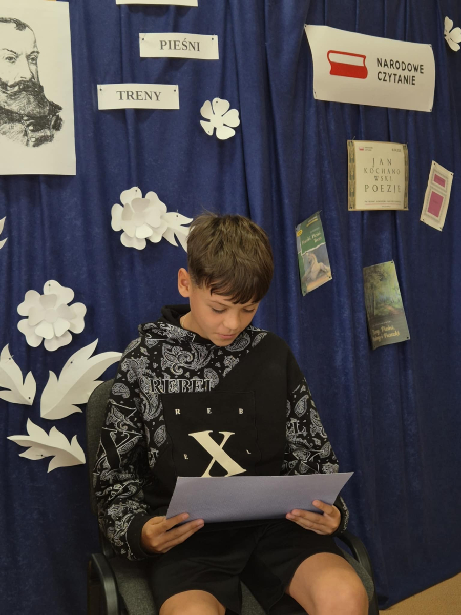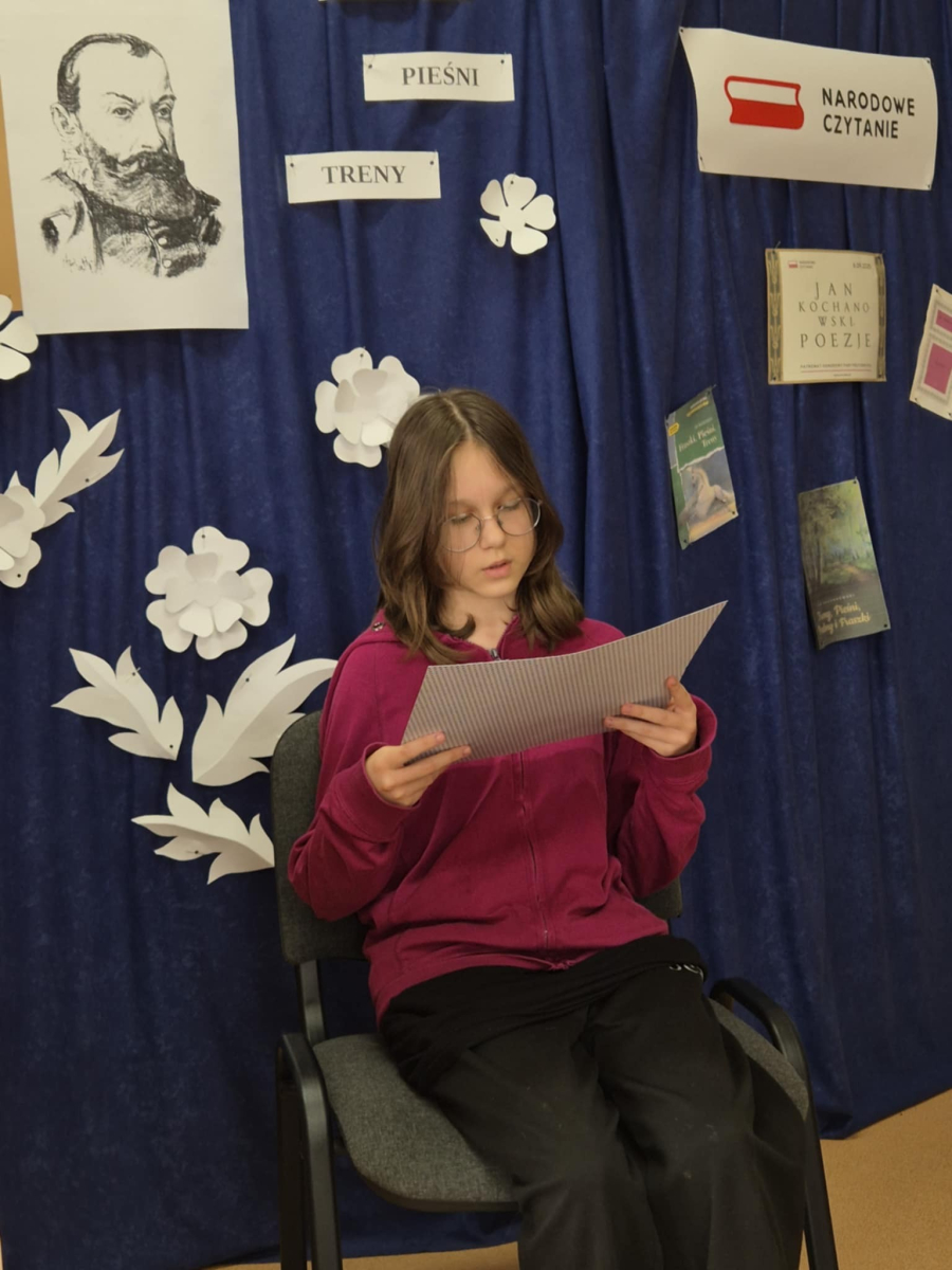 Narodowe Czytanie 2025 to akcja, w której wzięli udział uczniowie naszej szkoły. W środę na drugiej lekcji chętne dzieci z klas 4-8, ubrane w odświętne stroje, zaprezentowały na tle muzyki renesansowej wybrane przez siebie fraszki, pieśni i treny Jana Kochanowskiego.