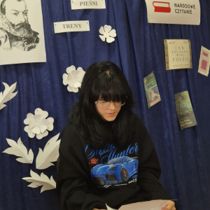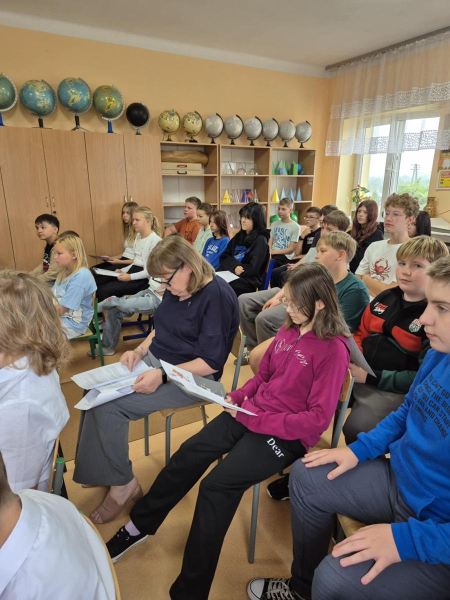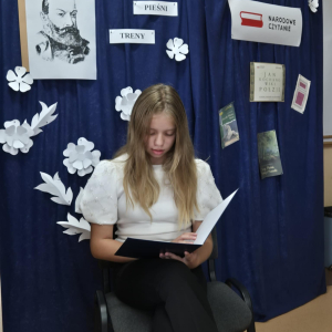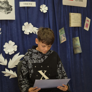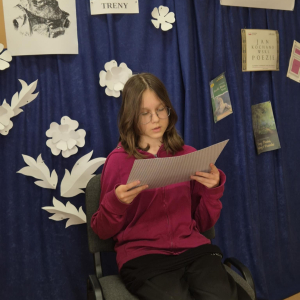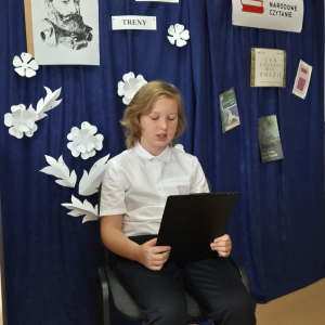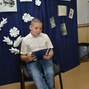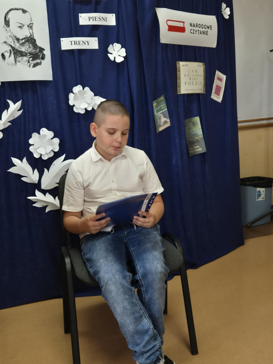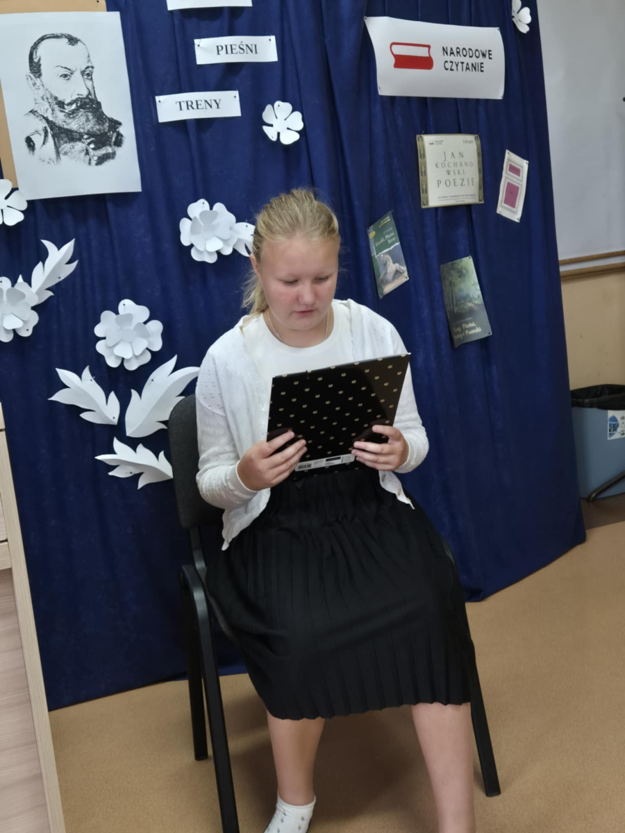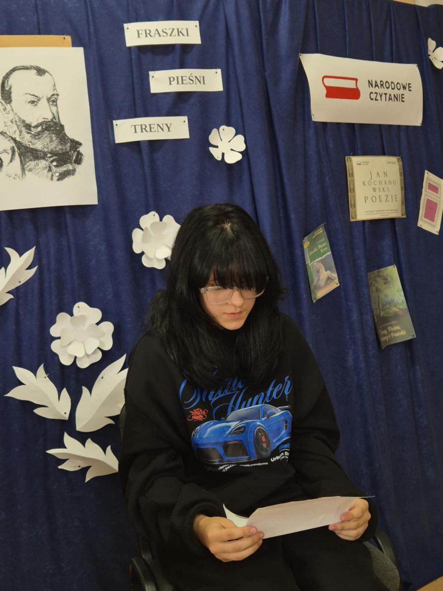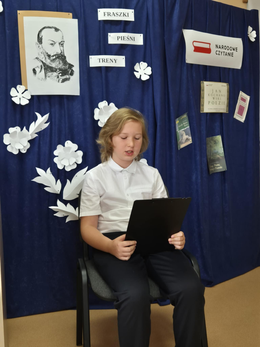 Narodowe Czytanie 2025 to akcja, w której wzięli udział uczniowie naszej szkoły. W środę na drugiej lekcji chętne dzieci z klas 4-8, ubrane w odświętne stroje, zaprezentowały na tle muzyki renesansowej wybrane przez siebie fraszki, pieśni i treny Jana Kochanowskiego.