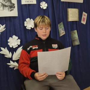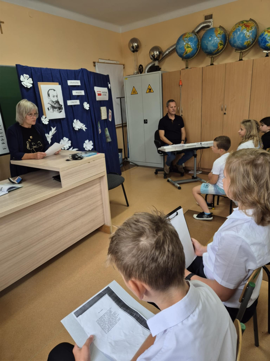 Występy dzieci przeplatane były ciekawostkami z życia poety, prezentowanymi przez opiekuna biblioteki. Największe zaciekawienie wzbudziła interpretacja wokalna pieśni ,,Czego chcesz od nas Panie" i „ Psalmu 91“ w wykonaniu nauczycieli.