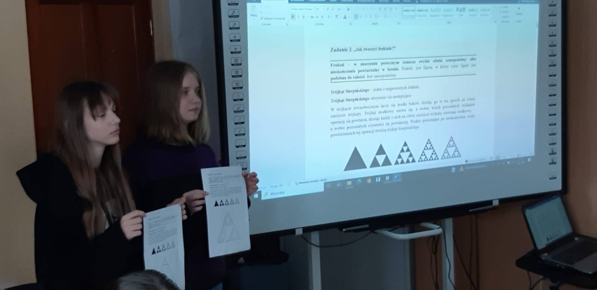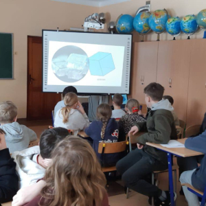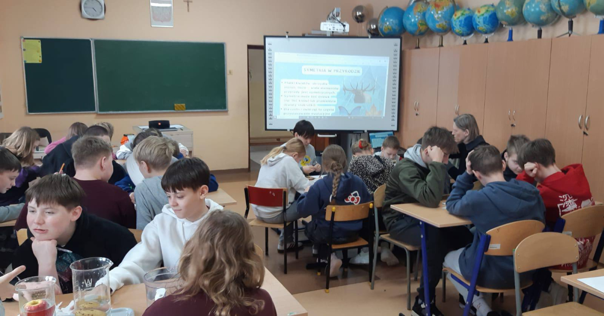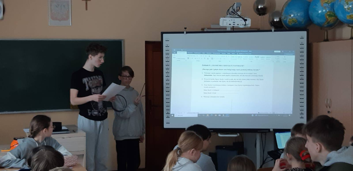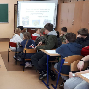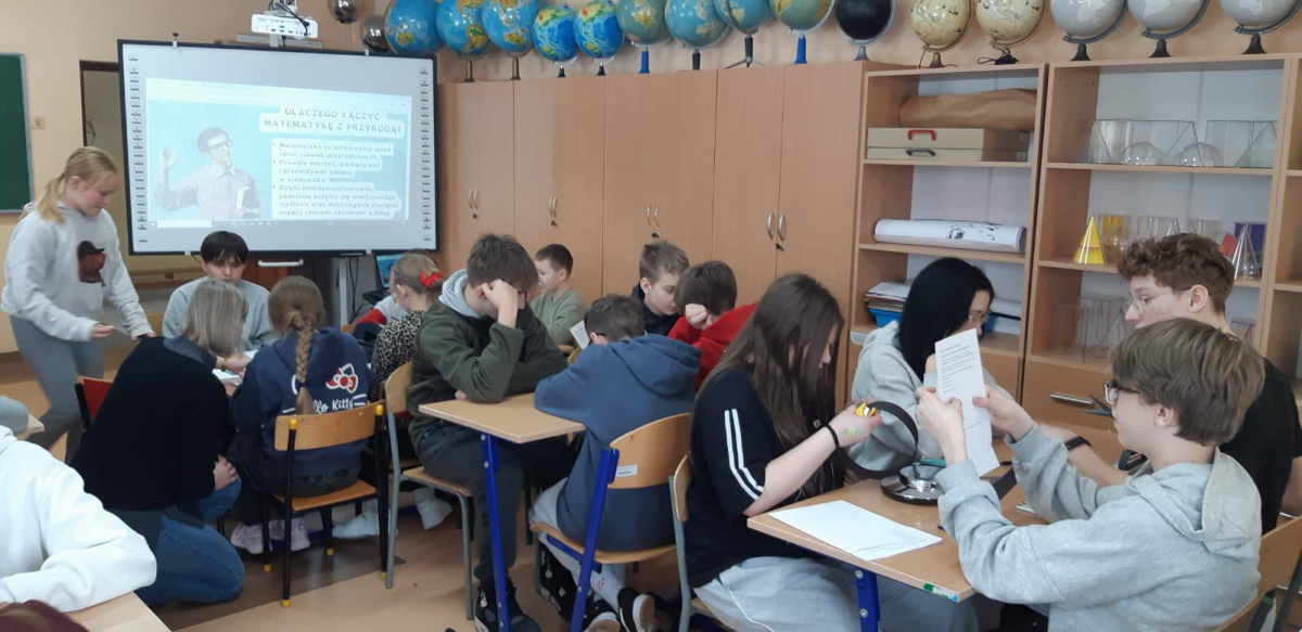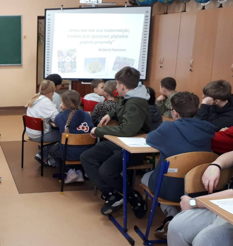 18 lutego uczniowie klas IV – VIII rozpoczęli realizację szkolnego interdyscyplinarnego projektu „Matematyka w świecie przyrody”, którego celem jest odkrywanie i zrozumienie związków między matematyką a otaczającą nas przyrodą. W trakcie spotkania obejrzeli film „Związki matematyki i przyrody”, z wielkim zaangażowaniem wykonali pierwsze praktyczne zadania oraz dokonali ich prezentacji.