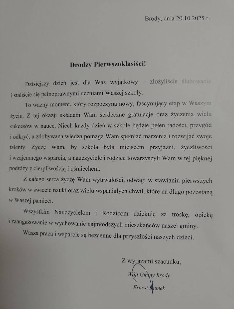 Odbyło się ono 24.10.2025 r. w Szkole Podstawowej im. Janusza Korczaka w Brodach. W obecności zaproszonej Dyrektor Centrum Usług Wspólnych pani Marty Turek, Dyrektora szkoły, rodziców, nauczycieli i starszych uczniów, najmłodsi złożyli uroczyste przyrzeczenie, że będą m.in. dobrymi Polakami, rzetelnymi uczniami i kolegami. Aktu pasowania na ucznia dokonała pani dyrektor Monika Krawczyk. Na pamiątkę tego ważnego wydarzenia każdy uczeń z rąk Dyrektor CUW otrzymał dyplom pasowania na ucznia. Ale zanim stali się pełnoprawnymi członkami społeczności szkolnej zaprezentowali swoje umiejętności w programie artystycznym przygotowanym pod kierunkiem wychowawczyni. Pierwszaki recytowały wiersze, śpiewały piosenki, a nawet piły z uśmiechem sok z cytryny udowadniając swoją siłę, odwagę i wytrzymałość. Występ był nagrodzony gromkimi brawami i wieloma słowami uznania. Dodatkową przyjemnością tego dnia były prezenty i słodki poczęstunek.