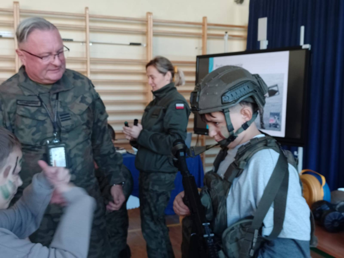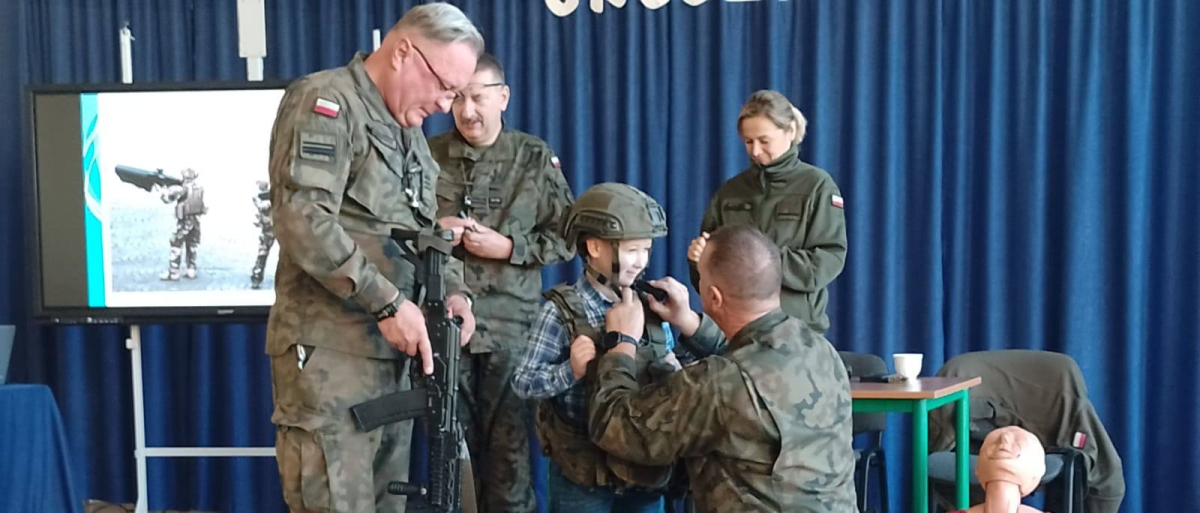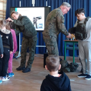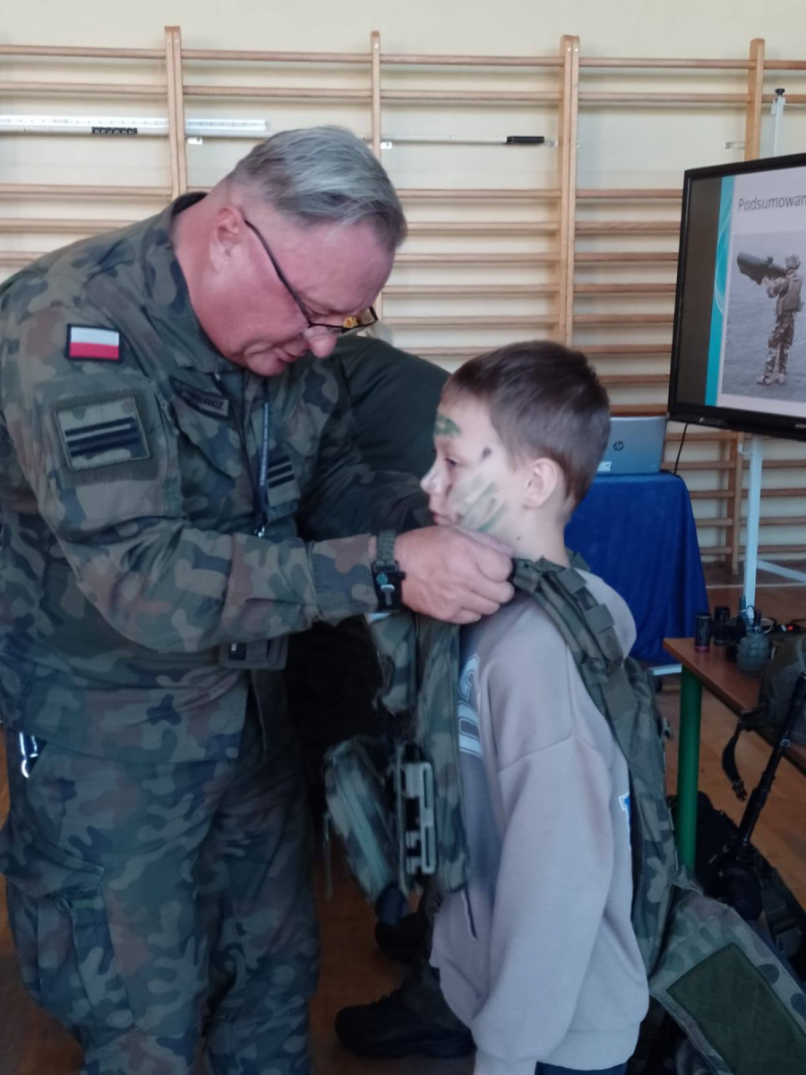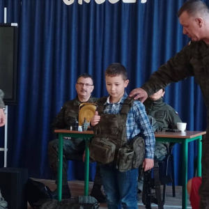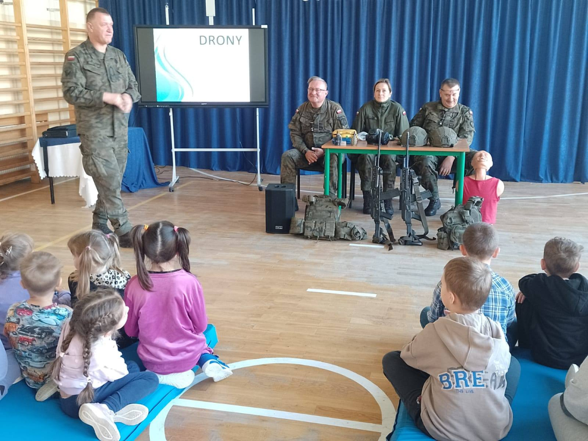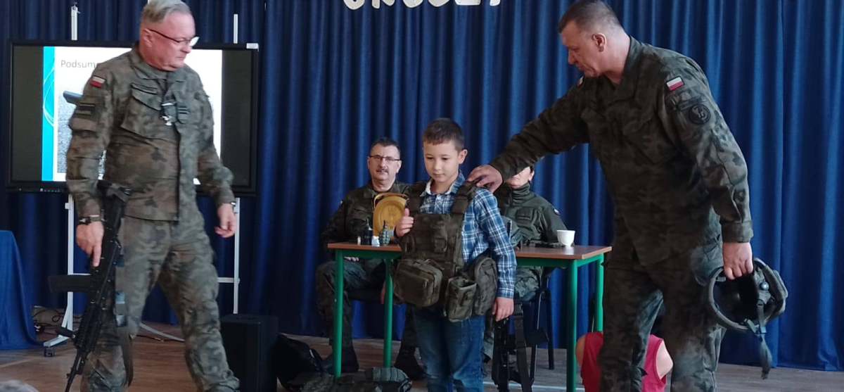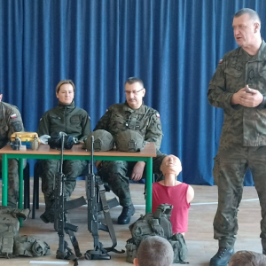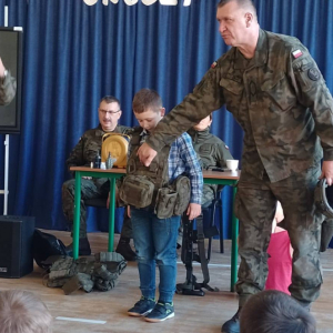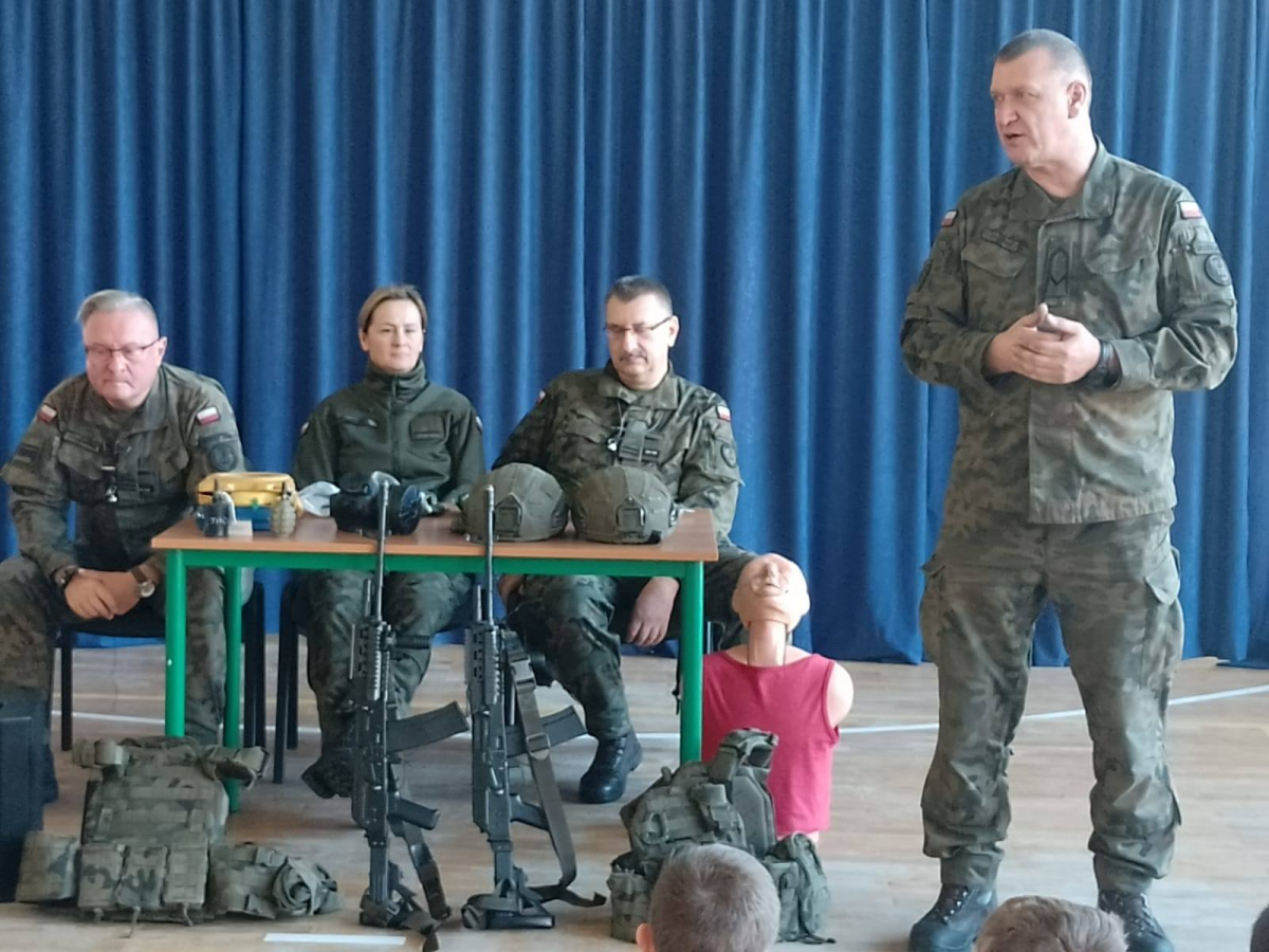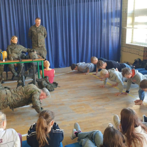 21 października naszą szkołę odwiedzili Żołnierze 10 Świętokrzyskiej Brygady Obrony Terytorialnej w Kielcach 103 Batalion Lekkiej Piechoty w Ostrowcu Świętokrzyskim Sekcja S9 Współpracy Cywilno wojskowej. Byli to: starszy szeregowy Magdalena Norman, starszy kapral Paweł Ozinkiewicz, kapral Krzysztof Zbrożyna i sierżant Artur Kulibab. Żołnierze przeprowadzili szkolenie dla uczniów, podczas którego uczyli zasad udzielania pierwszej pomocy przedmedycznej, poruszali ważne tematy dotyczące bezpieczeństwa i zachowania się w sytuacji zagrożenia oraz przećwiczyli z uczniami próbną ewakuację. Najwięcej frajdy sprawiły uczniom praktyczne wojskowe ćwiczenia: zbiórka w dwuszeregu, marsz, robienie pompek oraz przymierzanie kamizelek kuloodpornych i wojskowych hełmów. Dziękujemy za tę cenną lekcję.