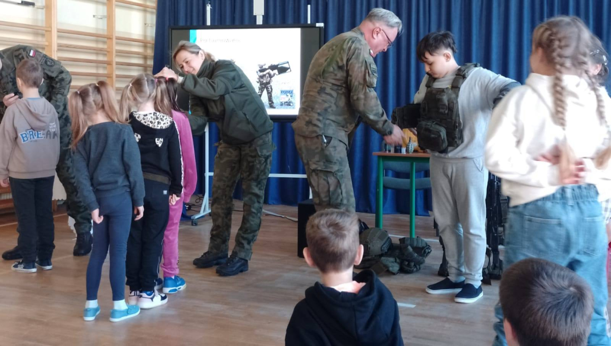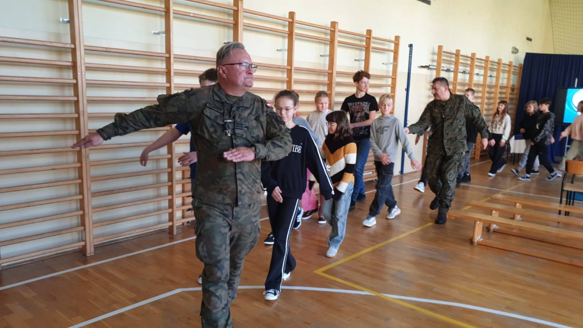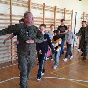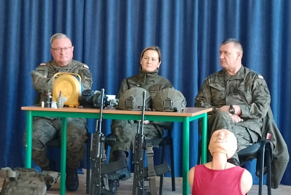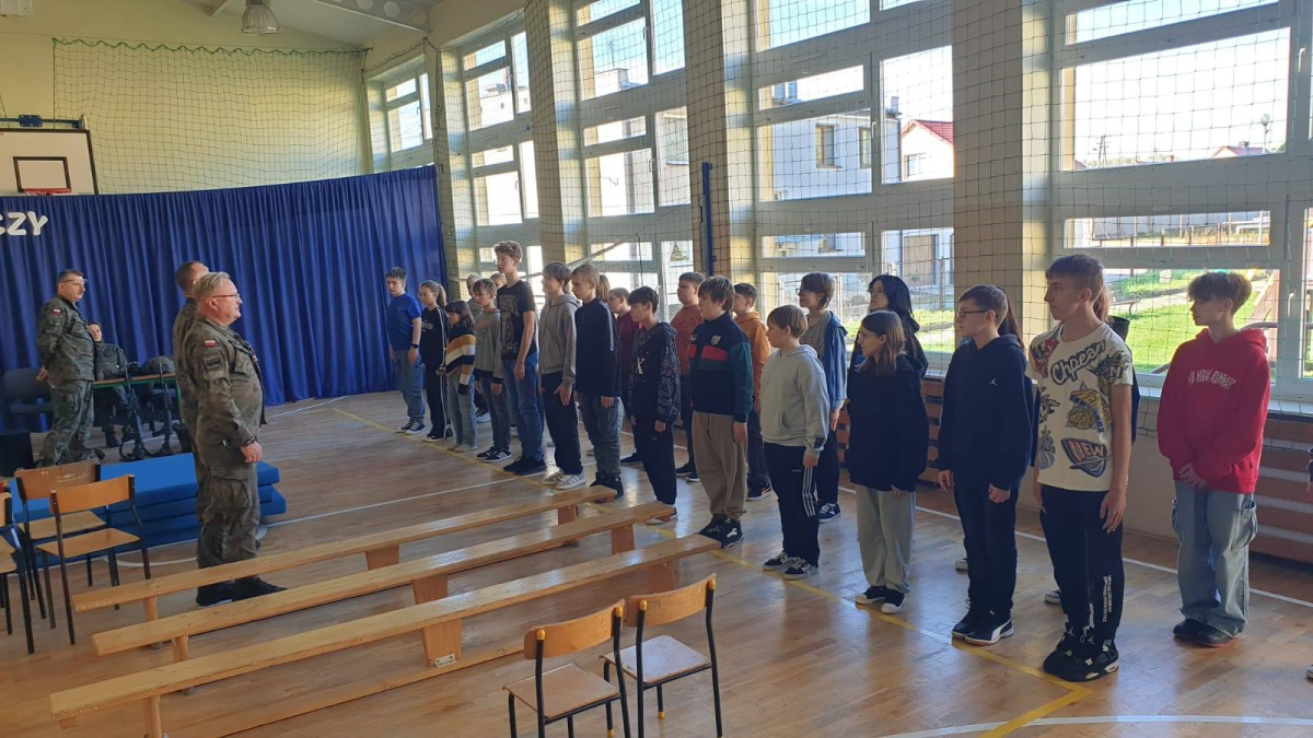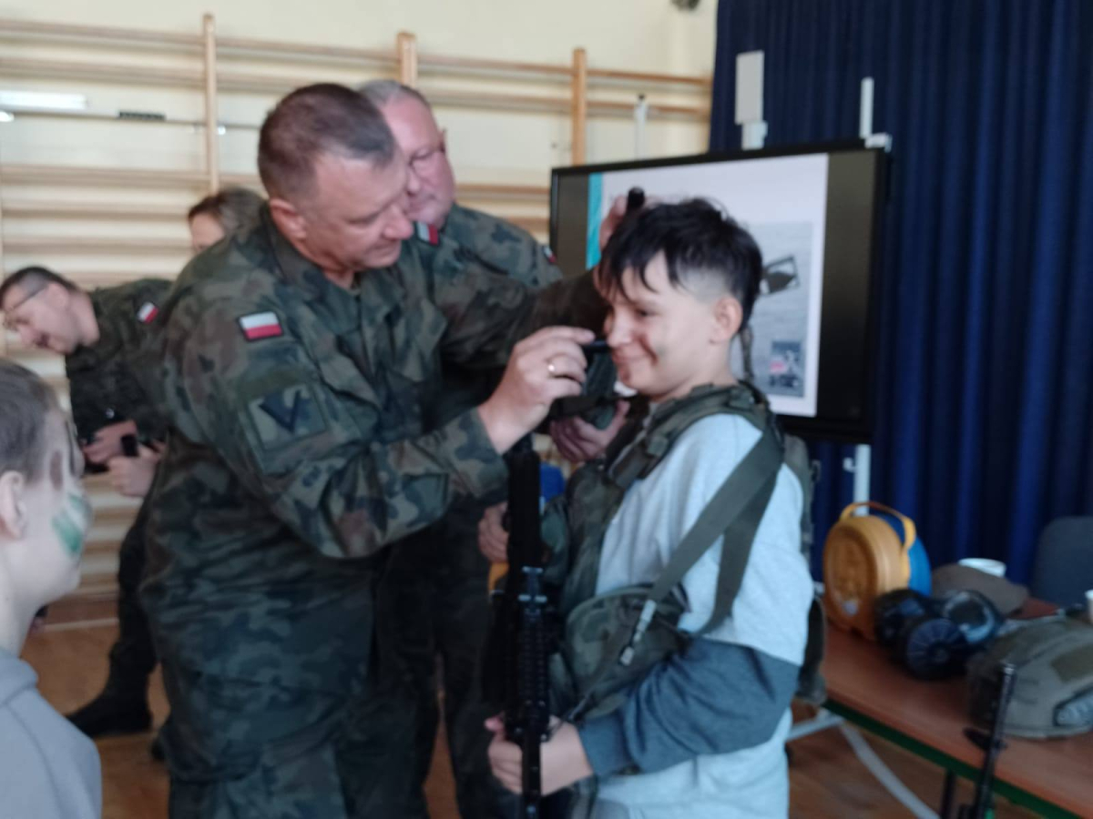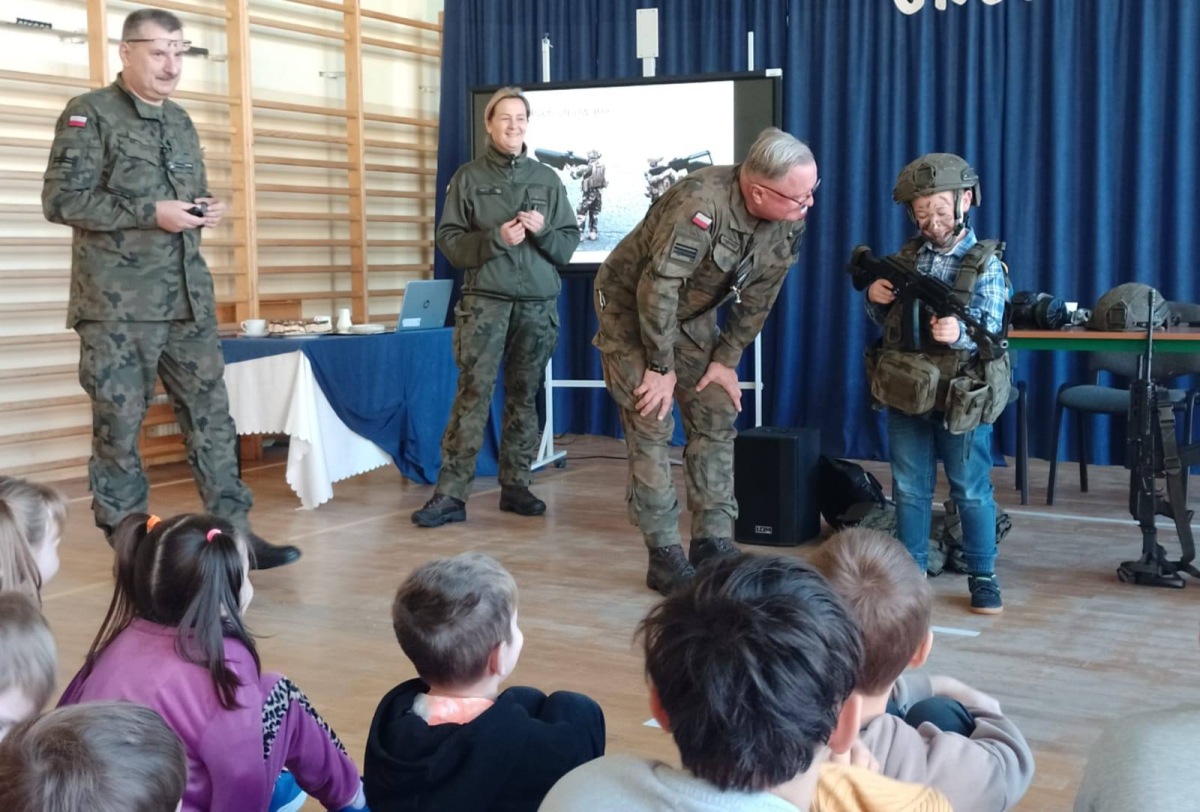 21 października naszą szkołę odwiedzili Żołnierze 10 Świętokrzyskiej Brygady Obrony Terytorialnej w Kielcach 103 Batalion Lekkiej Piechoty w Ostrowcu Świętokrzyskim Sekcja S9 Współpracy Cywilno wojskowej. Byli to: starszy szeregowy Magdalena Norman, starszy kapral Paweł Ozinkiewicz, kapral Krzysztof Zbrożyna i sierżant Artur Kulibab. Żołnierze przeprowadzili szkolenie dla uczniów, podczas którego uczyli zasad udzielania pierwszej pomocy przedmedycznej, poruszali ważne tematy dotyczące bezpieczeństwa i zachowania się w sytuacji zagrożenia oraz przećwiczyli z uczniami próbną ewakuację. Najwięcej frajdy sprawiły uczniom praktyczne wojskowe ćwiczenia: zbiórka w dwuszeregu, marsz, robienie pompek oraz przymierzanie kamizelek kuloodpornych i wojskowych hełmów. Dziękujemy za tę cenną lekcję.