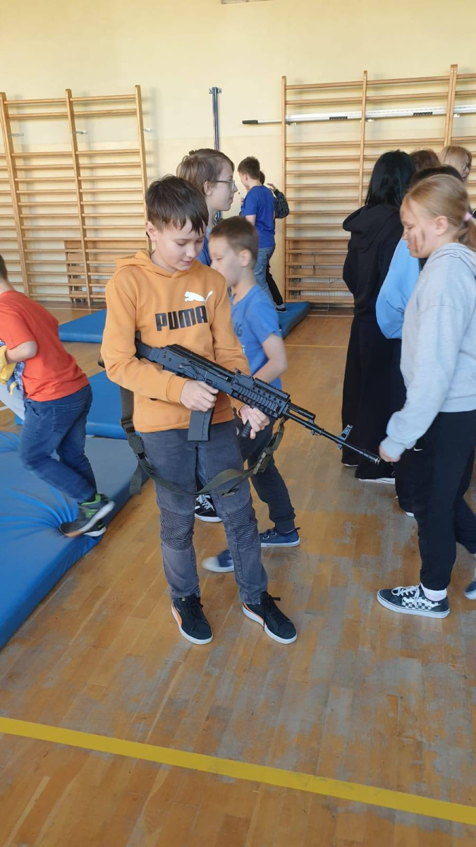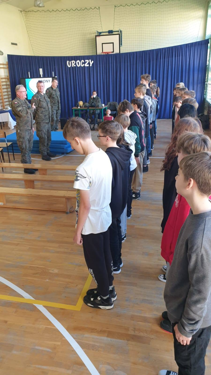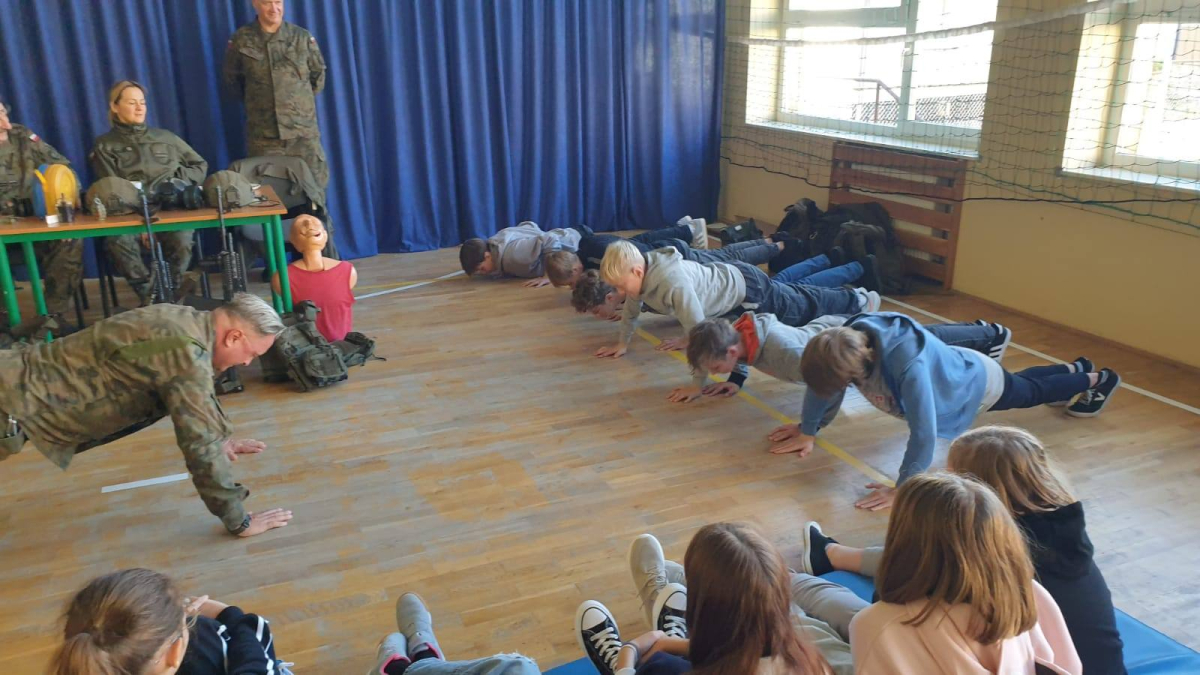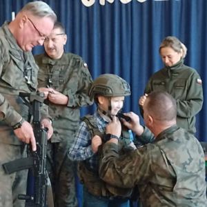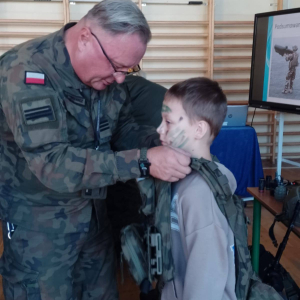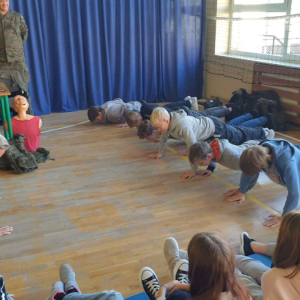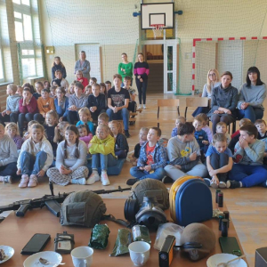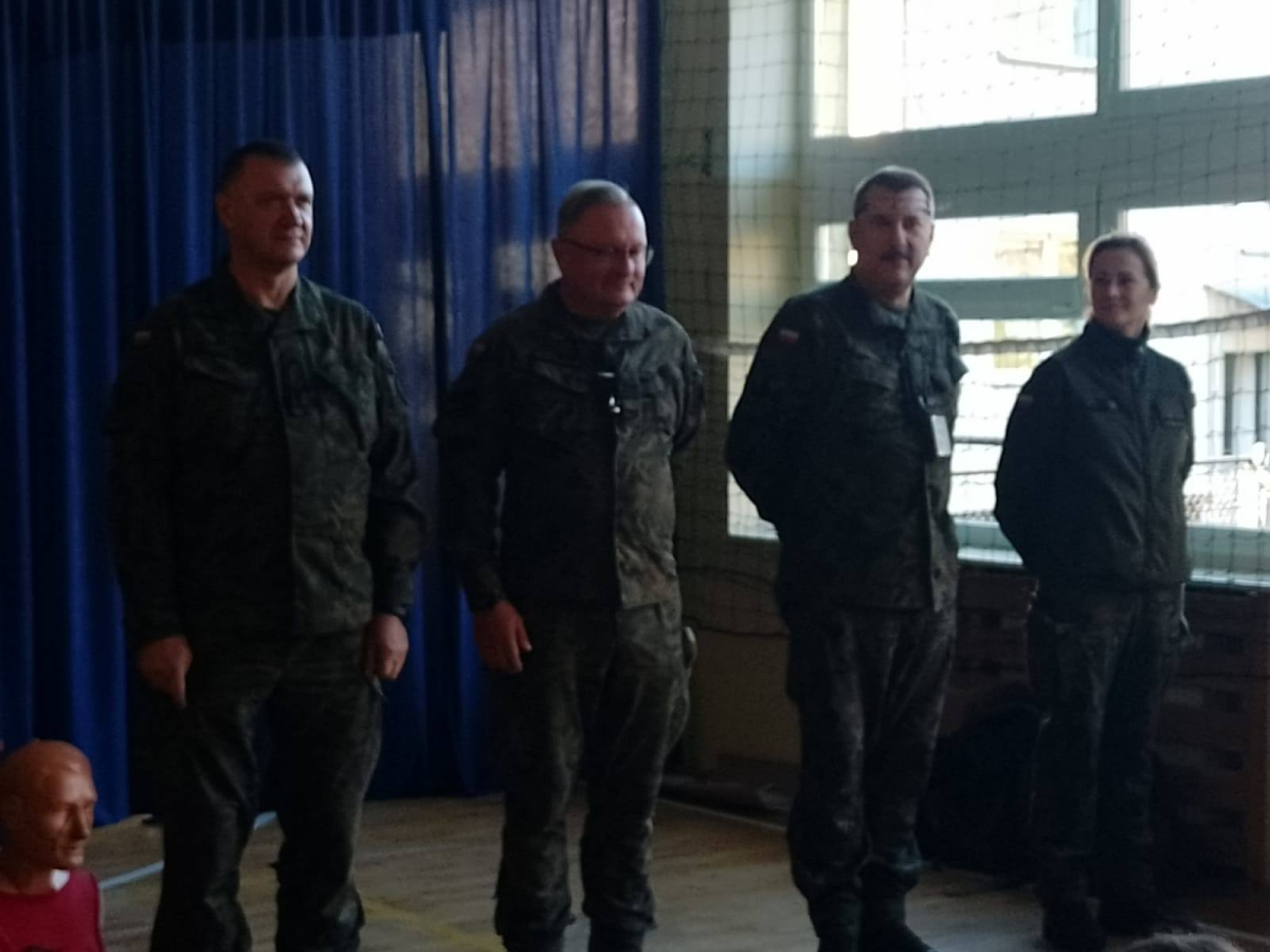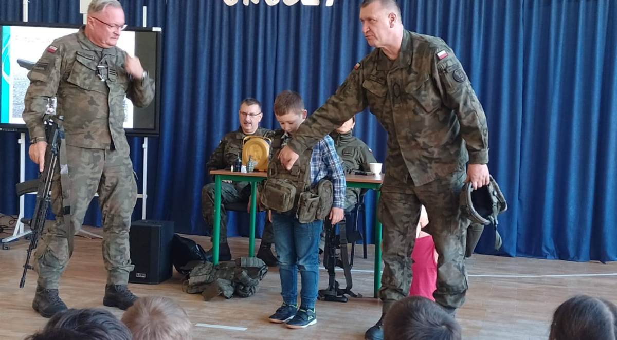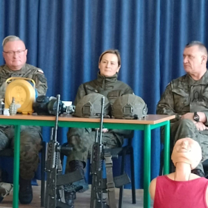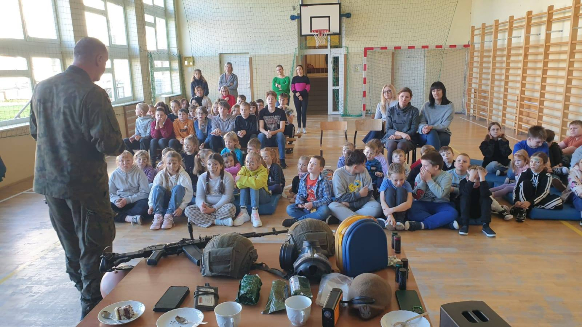 21 października naszą szkołę odwiedzili Żołnierze 10 Świętokrzyskiej Brygady Obrony Terytorialnej w Kielcach 103 Batalion Lekkiej Piechoty w Ostrowcu Świętokrzyskim Sekcja S9 Współpracy Cywilno wojskowej. Byli to: starszy szeregowy Magdalena Norman, starszy kapral Paweł Ozinkiewicz, kapral Krzysztof Zbrożyna i sierżant Artur Kulibab. Żołnierze przeprowadzili szkolenie dla uczniów, podczas którego uczyli zasad udzielania pierwszej pomocy przedmedycznej, poruszali ważne tematy dotyczące bezpieczeństwa i zachowania się w sytuacji zagrożenia oraz przećwiczyli z uczniami próbną ewakuację. Najwięcej frajdy sprawiły uczniom praktyczne wojskowe ćwiczenia: zbiórka w dwuszeregu, marsz, robienie pompek oraz przymierzanie kamizelek kuloodpornych i wojskowych hełmów. Dziękujemy za tę cenną lekcję.