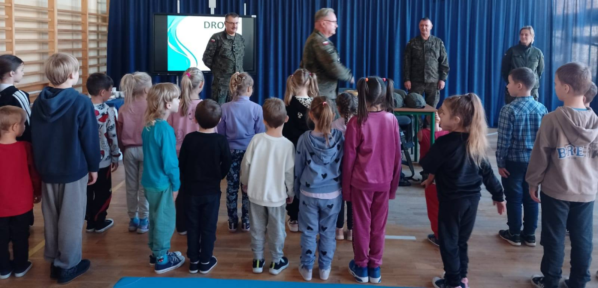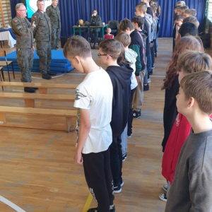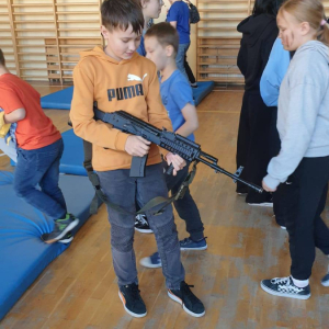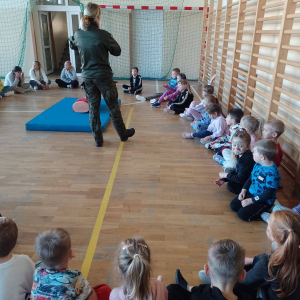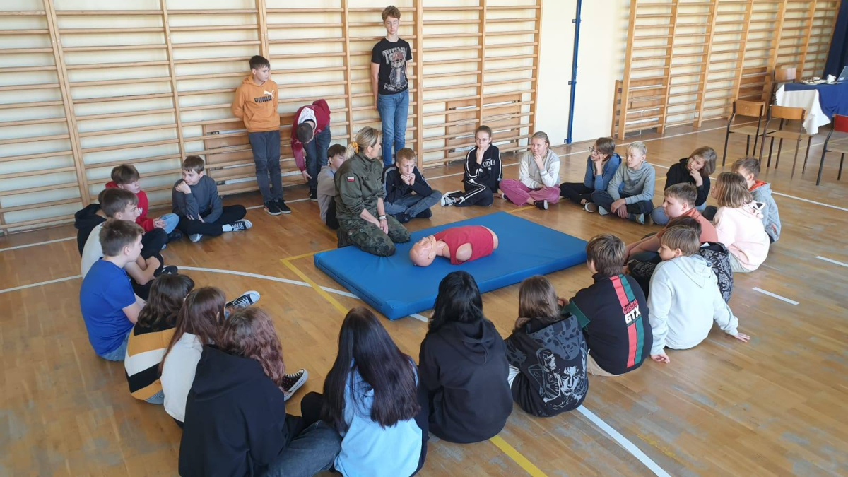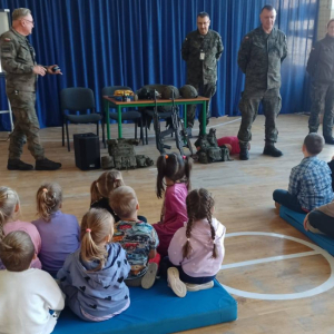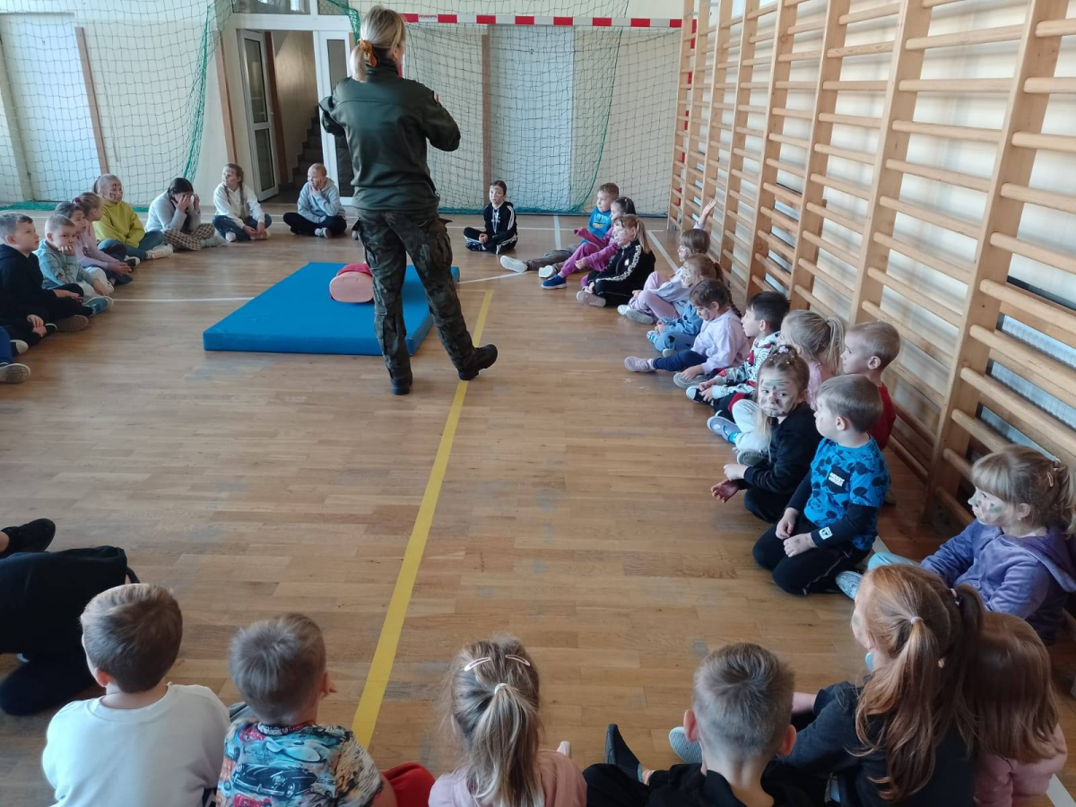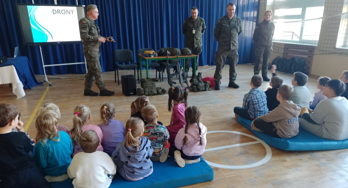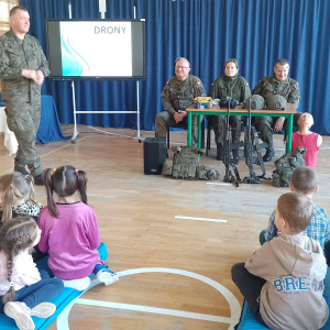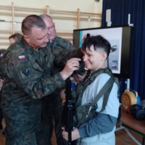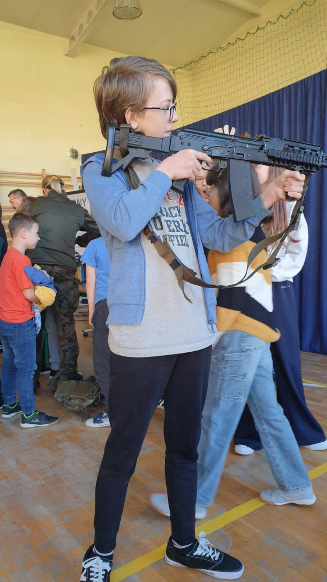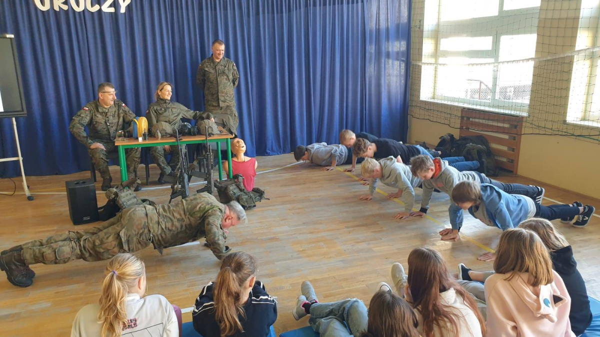 21 października naszą szkołę odwiedzili Żołnierze 10 Świętokrzyskiej Brygady Obrony Terytorialnej w Kielcach 103 Batalion Lekkiej Piechoty w Ostrowcu Świętokrzyskim Sekcja S9 Współpracy Cywilno wojskowej. Byli to: starszy szeregowy Magdalena Norman, starszy kapral Paweł Ozinkiewicz, kapral Krzysztof Zbrożyna i sierżant Artur Kulibab. Żołnierze przeprowadzili szkolenie dla uczniów, podczas którego uczyli zasad udzielania pierwszej pomocy przedmedycznej, poruszali ważne tematy dotyczące bezpieczeństwa i zachowania się w sytuacji zagrożenia oraz przećwiczyli z uczniami próbną ewakuację. Najwięcej frajdy sprawiły uczniom praktyczne wojskowe ćwiczenia: zbiórka w dwuszeregu, marsz, robienie pompek oraz przymierzanie kamizelek kuloodpornych i wojskowych hełmów. Dziękujemy za tę cenną lekcję.